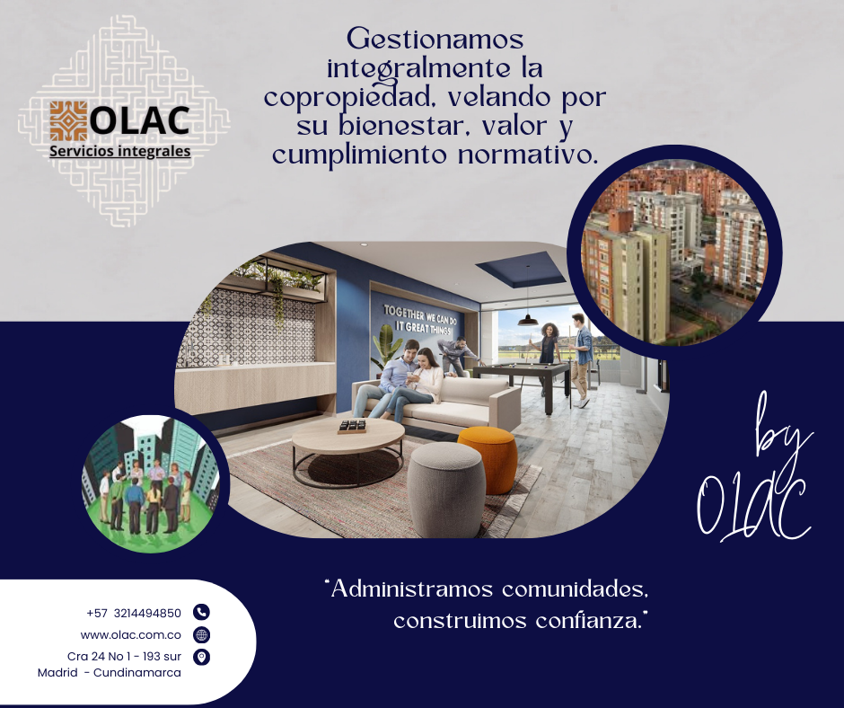 En OLAC Servicios Integrales transformamos la vida en comunidad. Combinamos tecnología, asesoría legal y experiencia humana para brindar soluciones eficientes, sostenibles y personalizadas en la gestión de propiedades residenciales. Nuestro objetivo es claro: crear entornos seguros, organizados y felices, donde cada residente disfrute de bienestar y armonía.